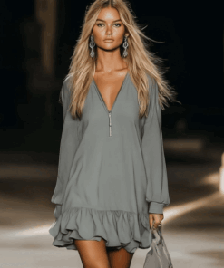 Casual Loose Fashion Zipper V-neck Long Sleeve Lotus Leaf Hem Gray Mini Dress
